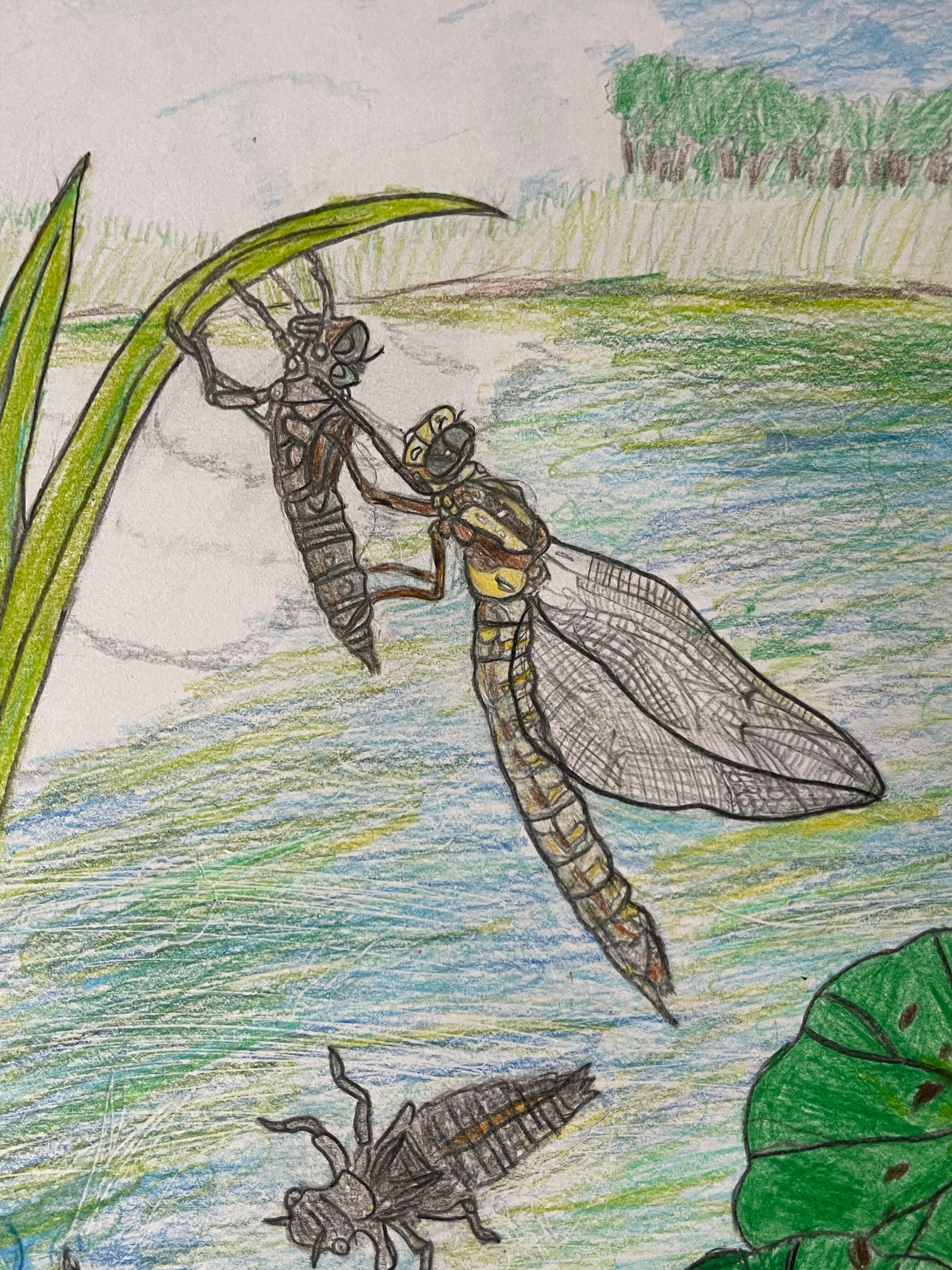 夏休みのトンボの絵のコンクールにむけて、かなへびくんが選んだのは、「羽化」のシーンでした。繊細な羽も丁寧に描き込んでいます。