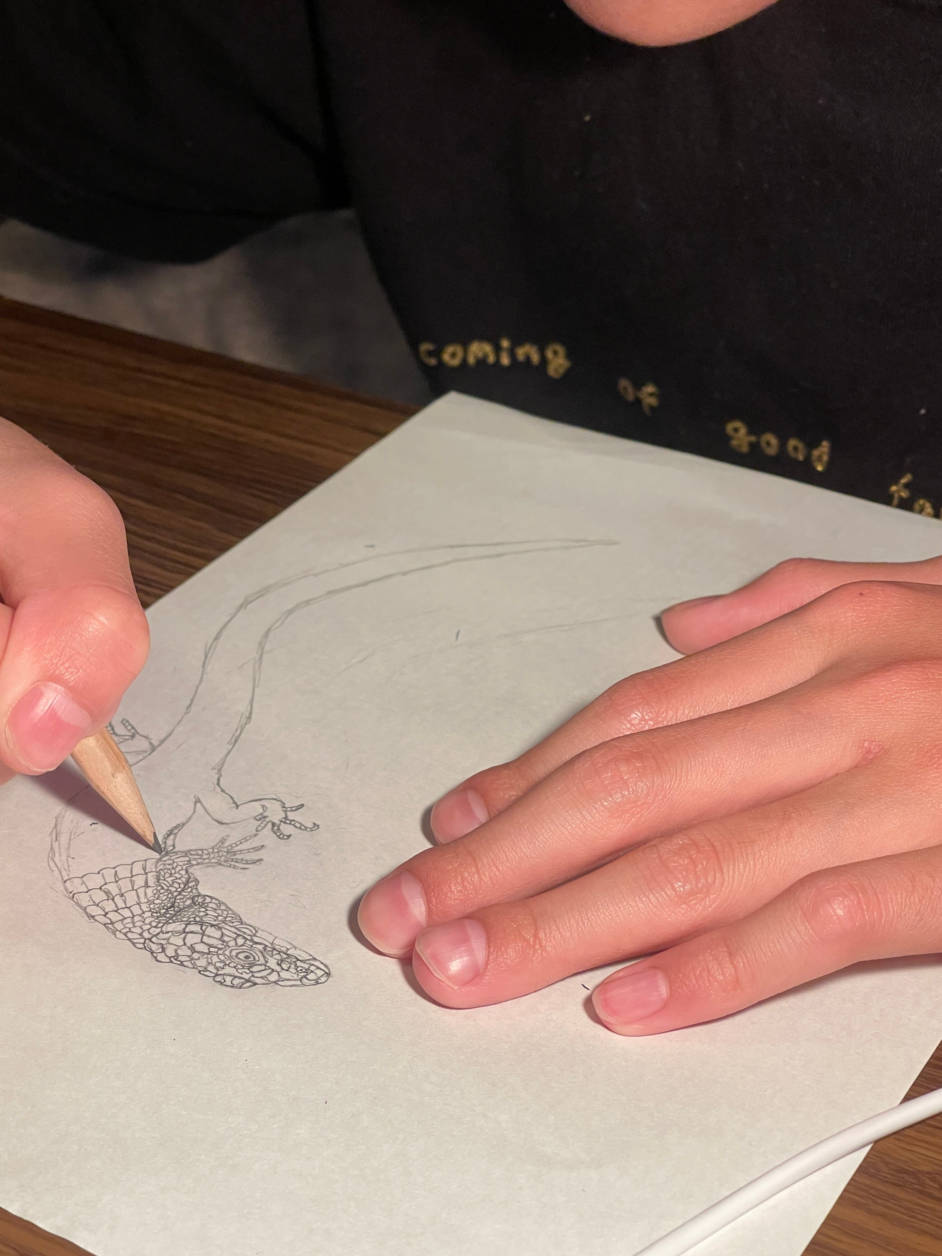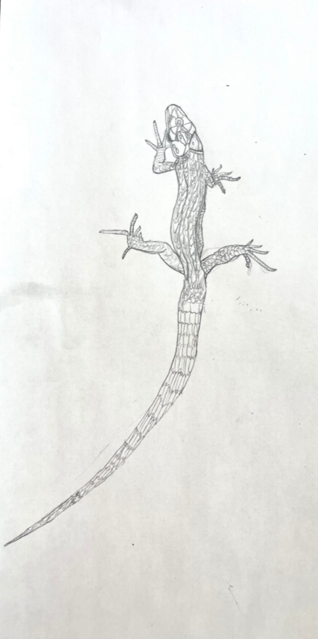 10歳の時に描いた「しっぽの長いお気に入りのカナヘビ」は、まるで肩まで登ってきそうな迫力。