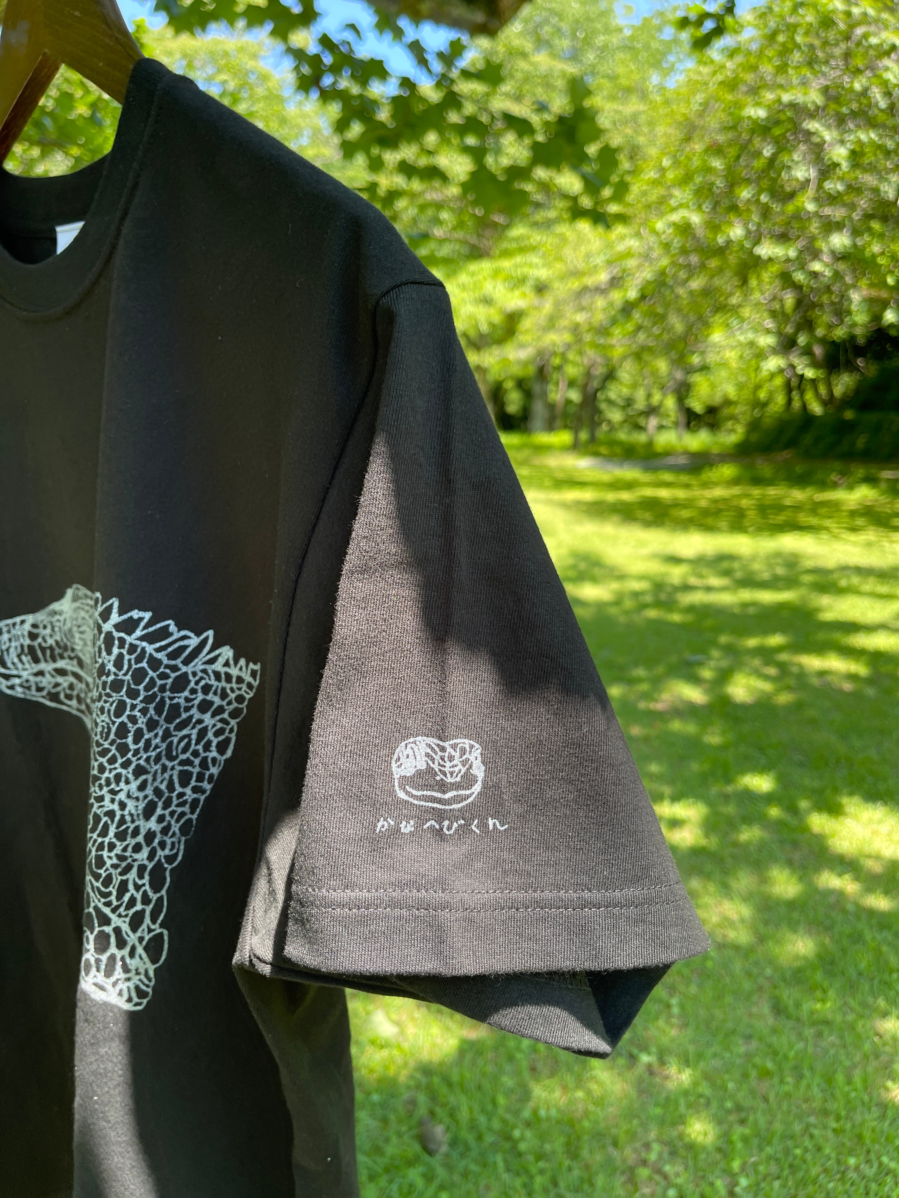 シルバーラメのインクが光にあたるとキラキラ✨します。左の袖口には、かなへびくんのブランドロゴがプリントされています。(シルバーのラメ色)