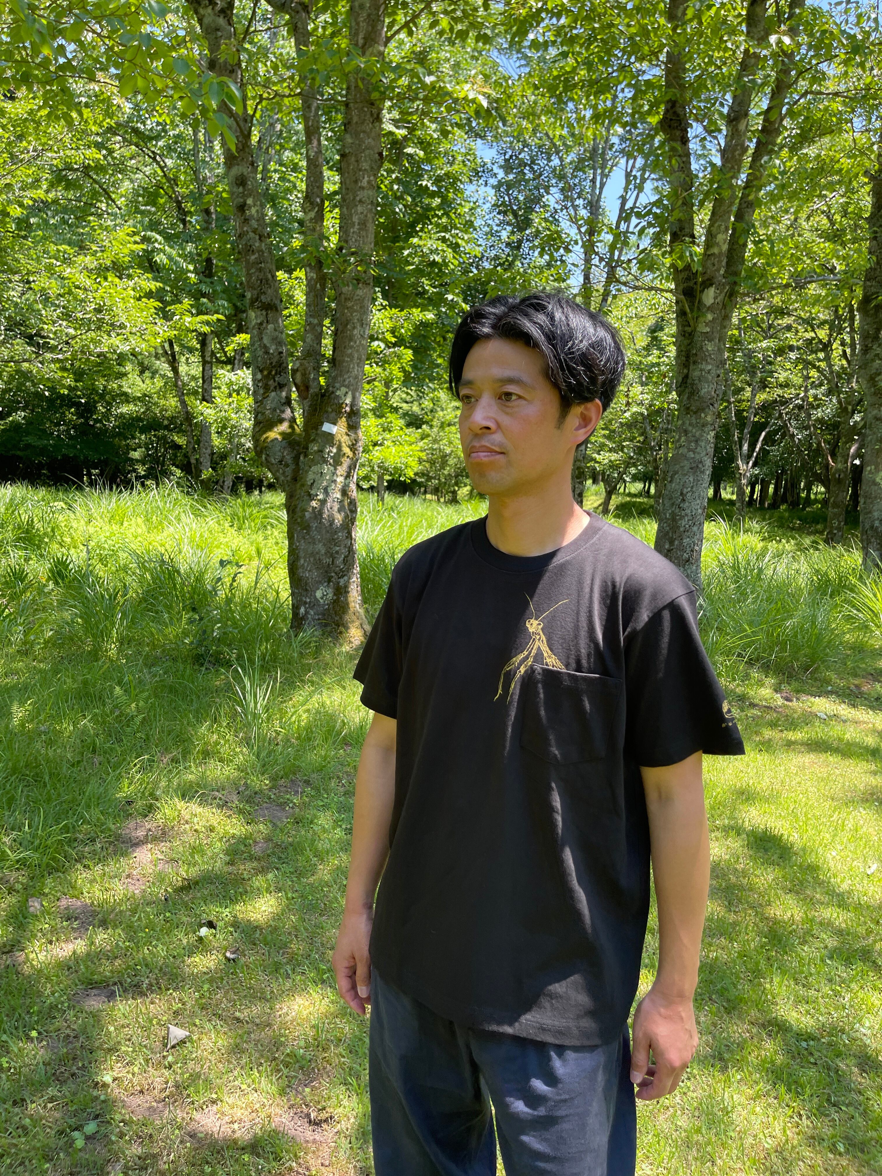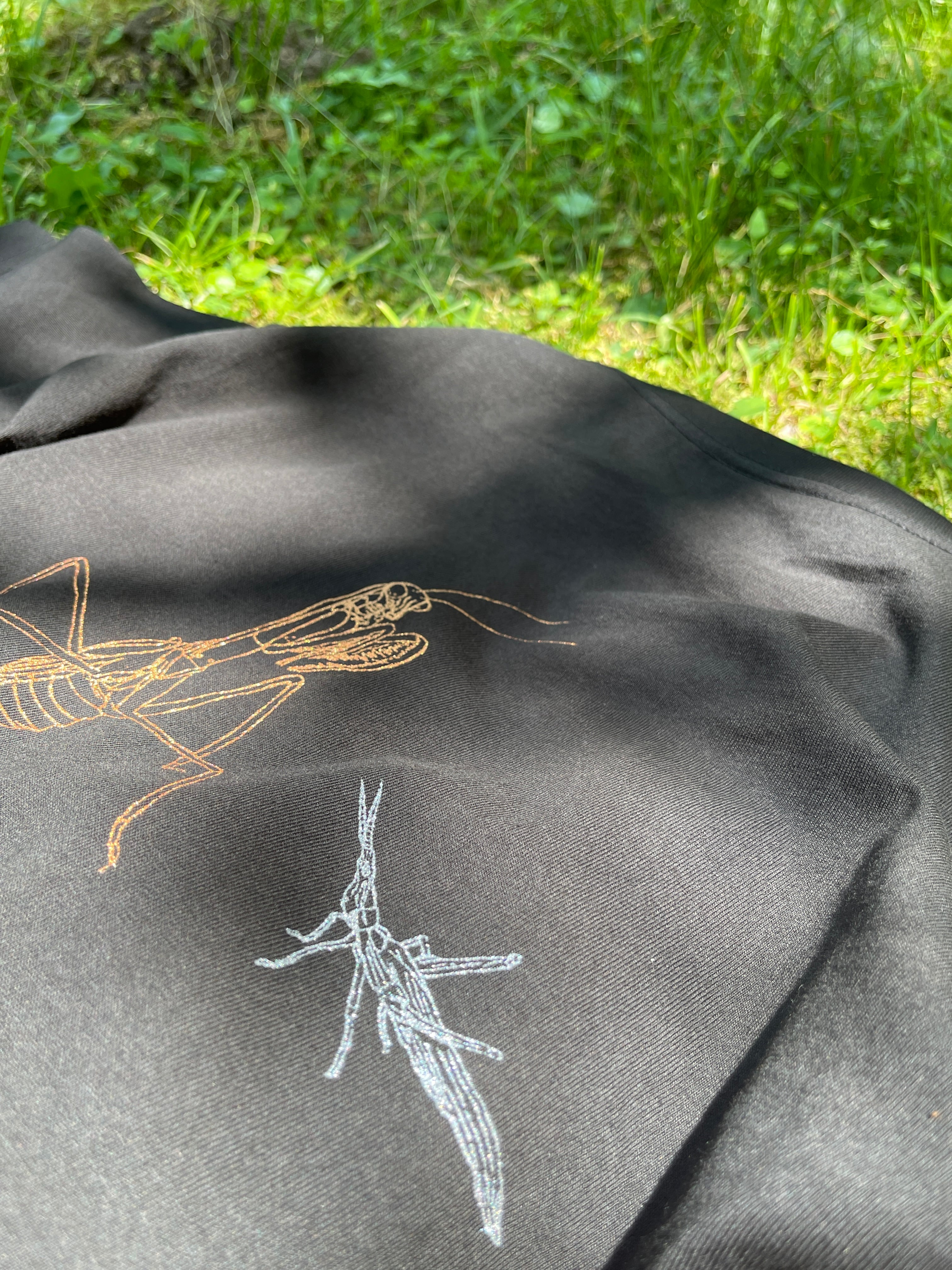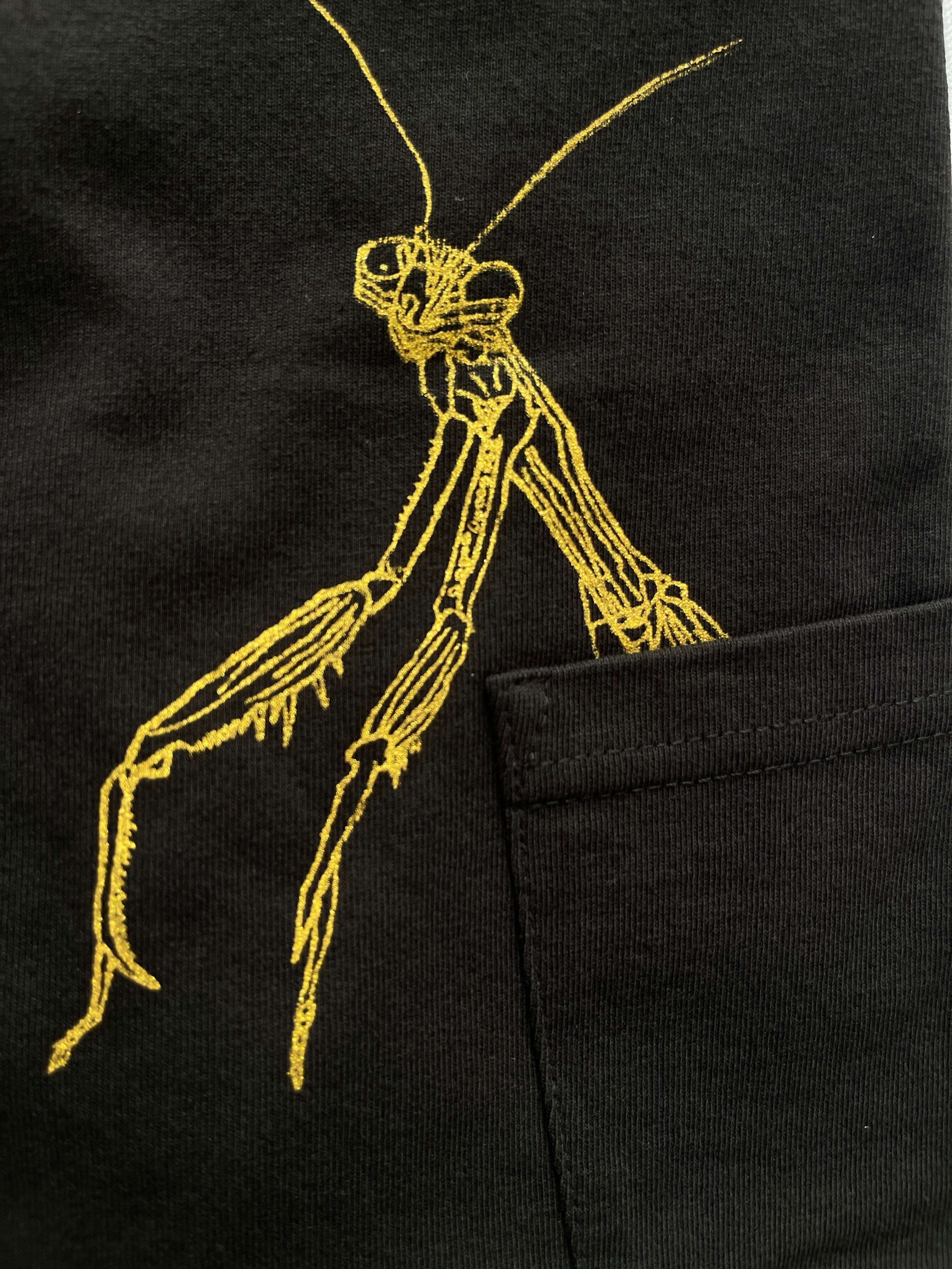 ポケットのカマキリは、ゴールドのラメインク、バックプリントは、ブロンズとシルバーのラメインクで光にあたるとキラキラ✨します。左の袖口には、かなへびくんのブランドロゴがプリントされています。(ゴールドのラメ色)