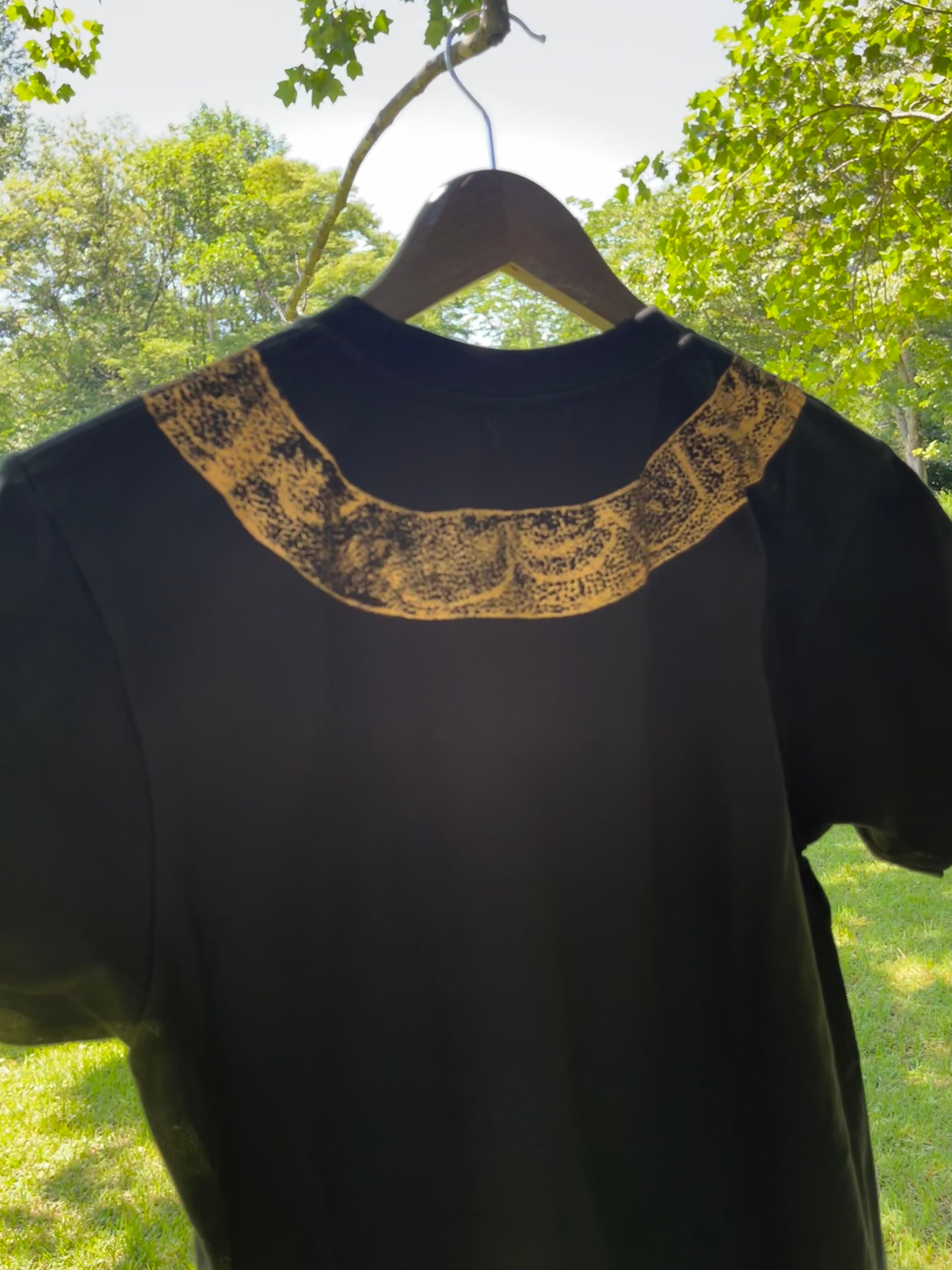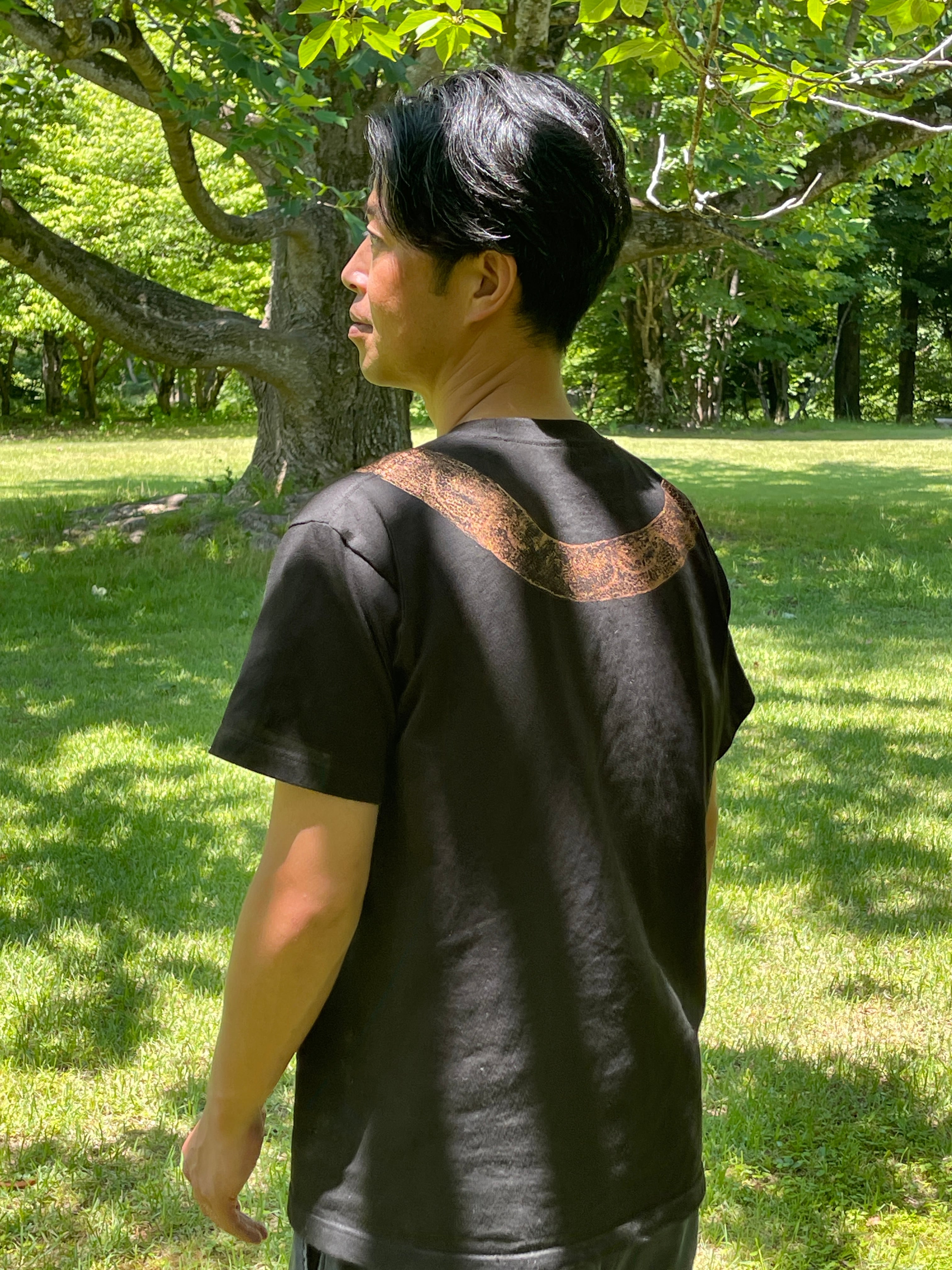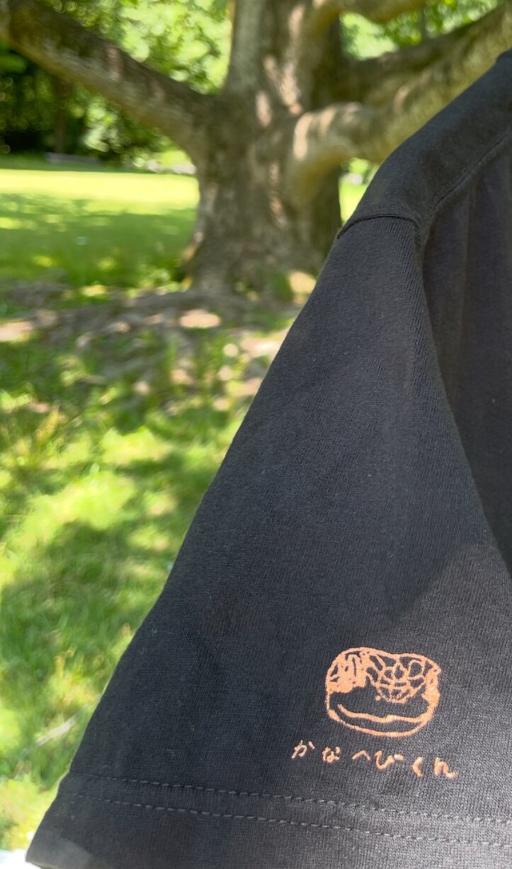 ブロンズのラメ色でプリントされており、光にあたるとキラキラ✨します。左の袖口には、かなへびくんのブランドロゴがプリントされています。(ブロンズのラメ色)