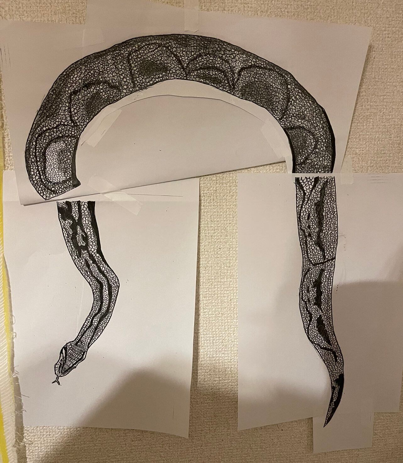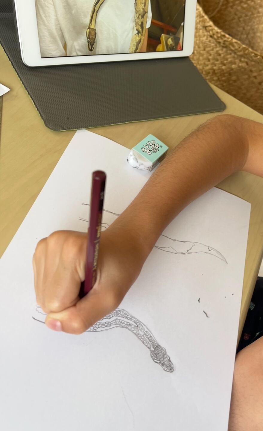 11歳のときに爬虫類カフェで蛇をワクワクしながら首に巻きました。その時の蛇を写真を見ながら描きました。